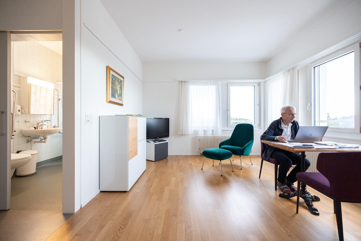 Wir bieten möblierte Gästezimmer für Menschen an, die einen Pflege- und Betreuungsbedarf haben und eine Übergangs- oder Anschlusslösung brauchen, sei es nach einem Spitalaufenthalt, wenn die Betreuung und Pflege zu Hause nicht mehr gewährleistet werden kann, oder unverbindlich zum Probewohnen. Die Aufenthaltsdauer beträgt mindestens drei Wochen und kann mehrere Wochen betragen. Die Verfügbarkeit wird auf Anfrage geprüft.
